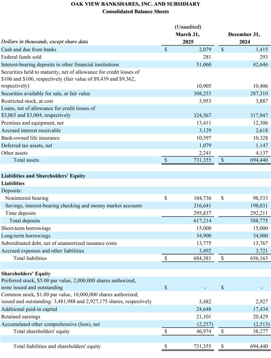 “Our exceptional team delivered $1.13 million growth in earnings in 2025. Your Company’s strong financial performance reflects our unwavering commitment to striking the optimal balance between safety and soundness, profitability, and growth. We are very proud of these results and feel that we are well positioned to seize opportunities as they arise in 2026 and beyond.” said Michael Ewing, CEO and Chairman of the Board. Mr. Ewing continued, “Oak View National Bank exists to serve our communities and deliver durable and compelling returns to shareholders. We are heartened that our community bank value proposition continues to resonate, which is evidenced by deepening relationships with current clients, steady growth in new relationships, as well as selective additions of talented and trustworthy banking professionals.”