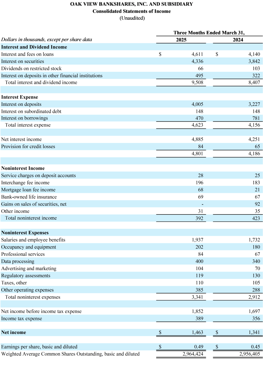 Warrenton, VA, January 30, 2026 - Oak View Bankshares, Inc. (the “Company”) (OTC OTCID: OAKV), parent company of Oak View National Bank (the “Bank”), reported net income of $7.22 million for the year ended December 31, 2025, compared to net income of $6.10 million for the year ended December 31, 2024, an increase of 18.48%. Basic and diluted earnings per share for the year ended December 31, 2025, were $2.15 compared to $2.07 for the year ended December 31, 2024.
