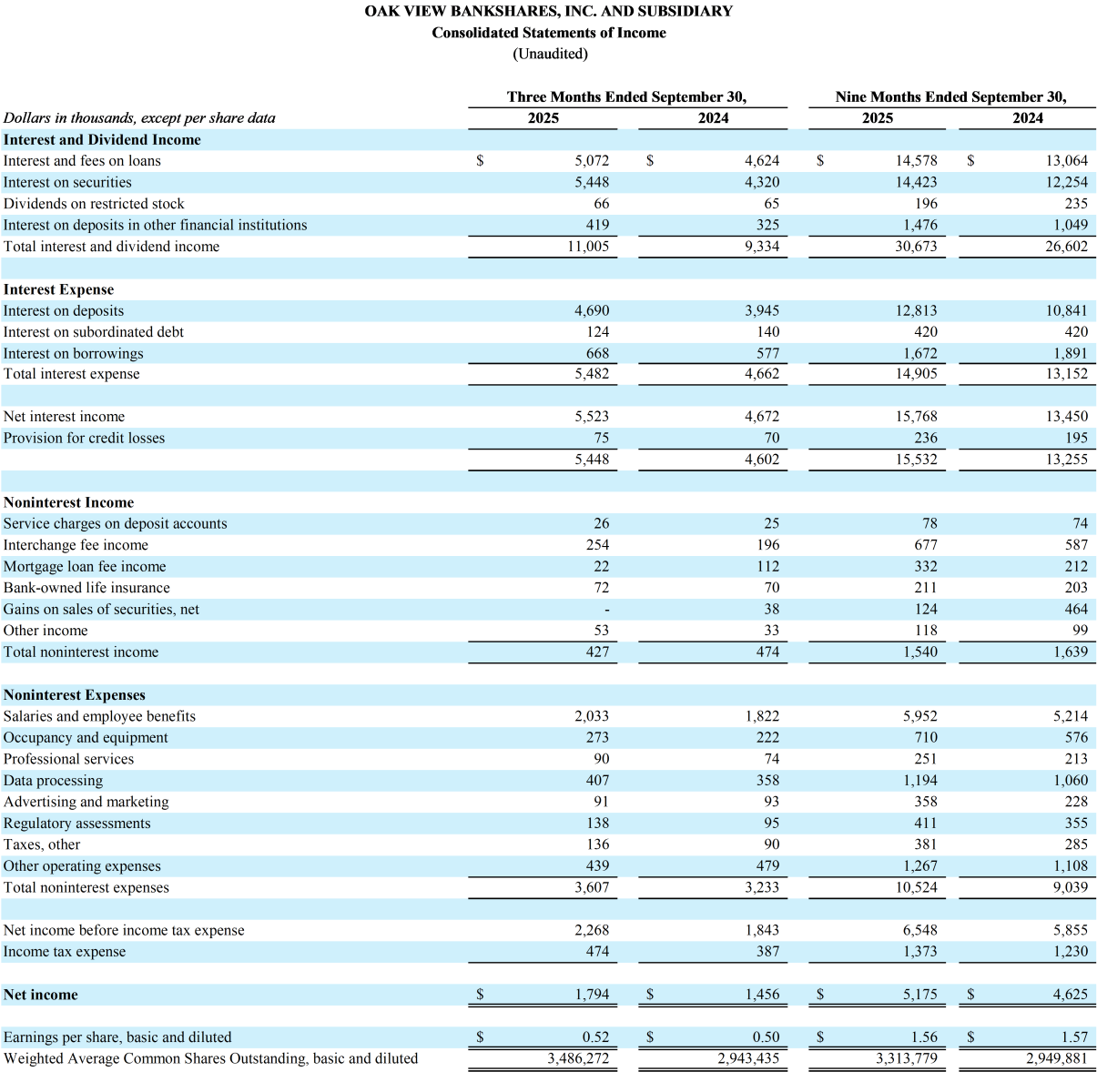 Warrenton, VA, October 16, 2025 - Oak View Bankshares, Inc. (the “Company”) (OTCID: OAKV), parent company of Oak View National Bank (the “Bank”), reported net income of $1.8 million for the quarter ended September 30, 2025, compared to net income of $1.5 million for the quarter ended September 30, 2024. Net income for the nine months ended September 30, 2025, was $5.2 million, compared to $4.6 million for the nine months ended September 30, 2024.